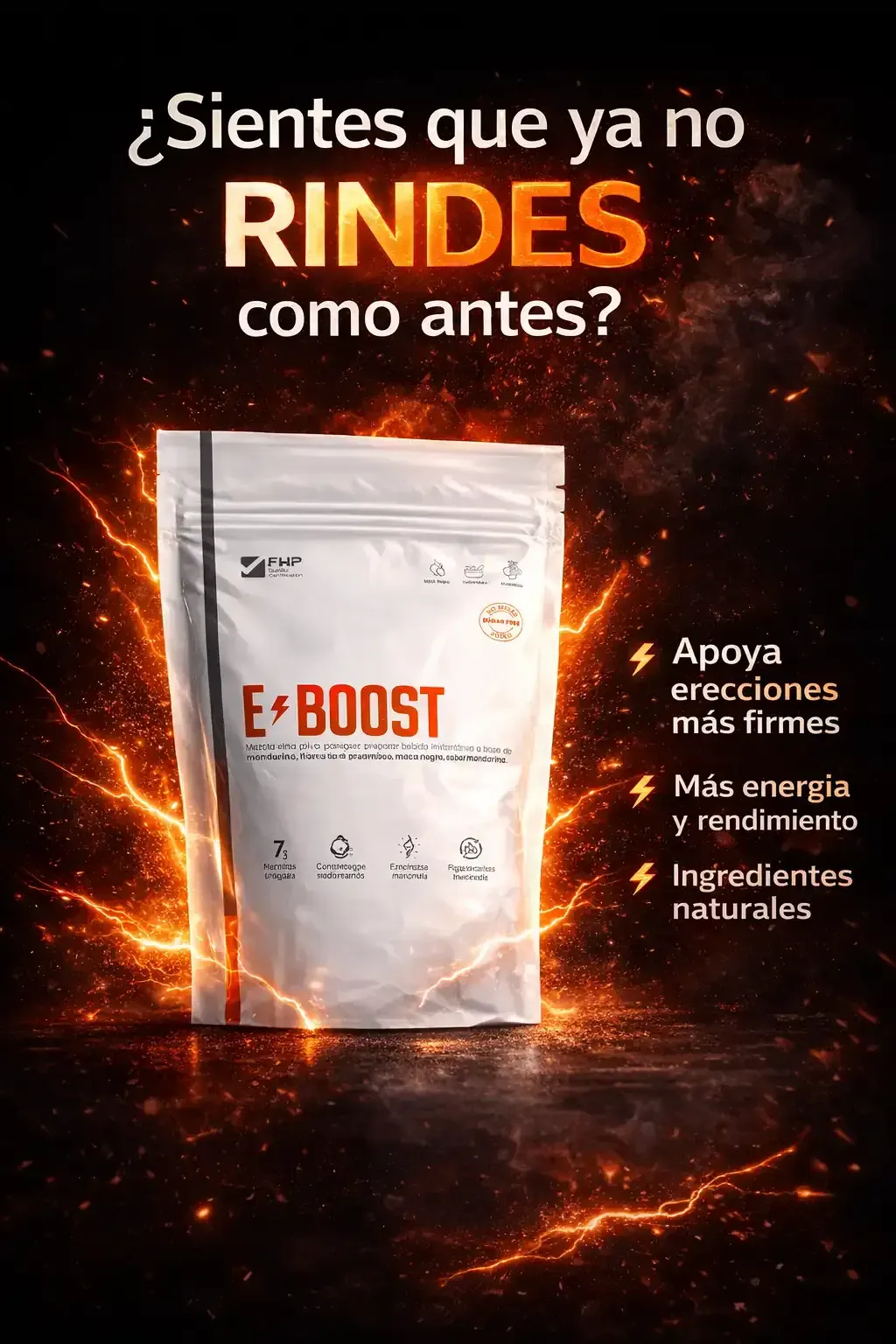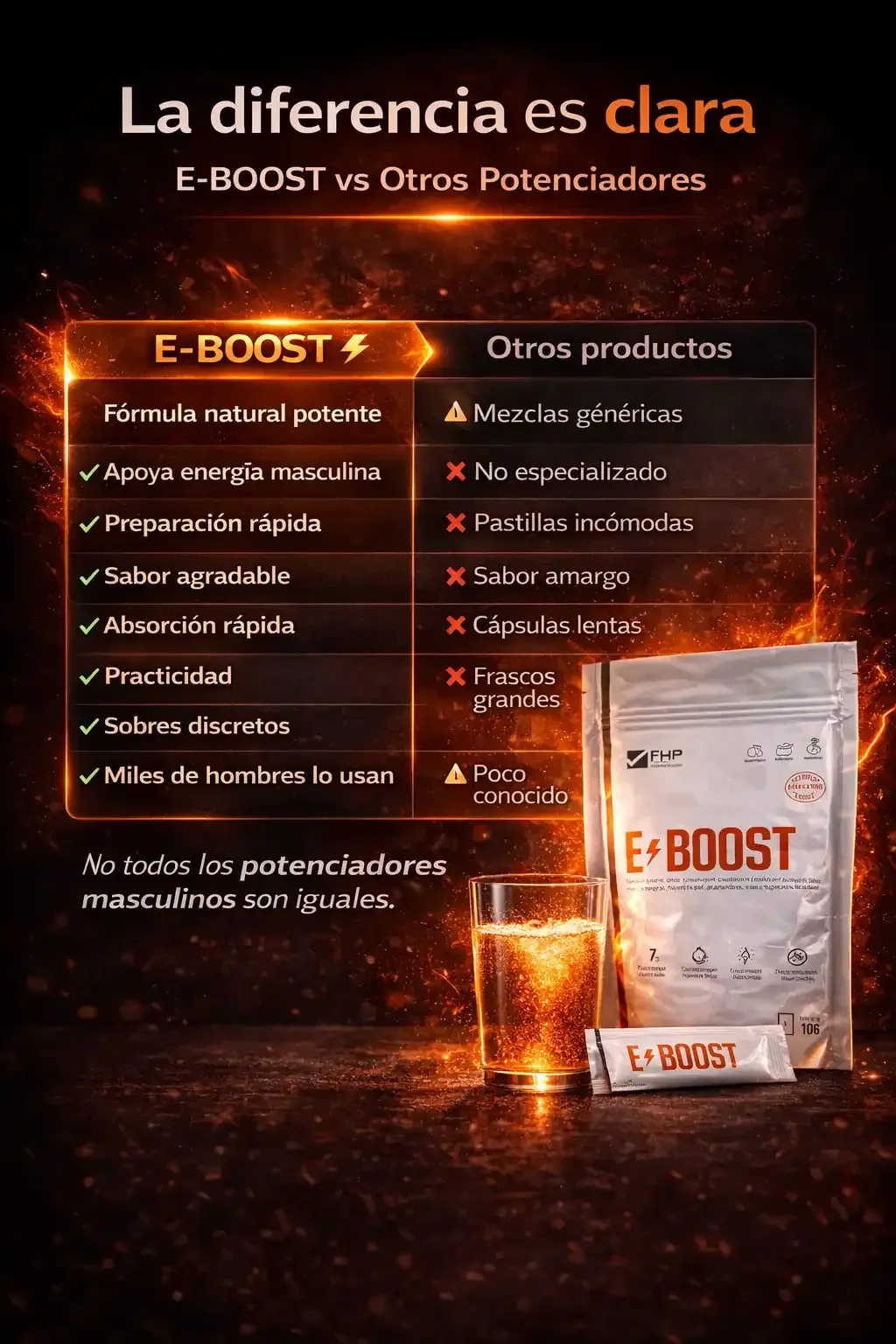 Porque E-BOOST no es un químico de efecto momentáneo, sino una fórmula completa que recupera tu energía, deseo y rendimiento desde dentro. Mientras otros productos sólo estimulan temporalmente, E-BOOST fortalece tu cuerpo, mejora tu circulación y potencia tu confianza día tras día.