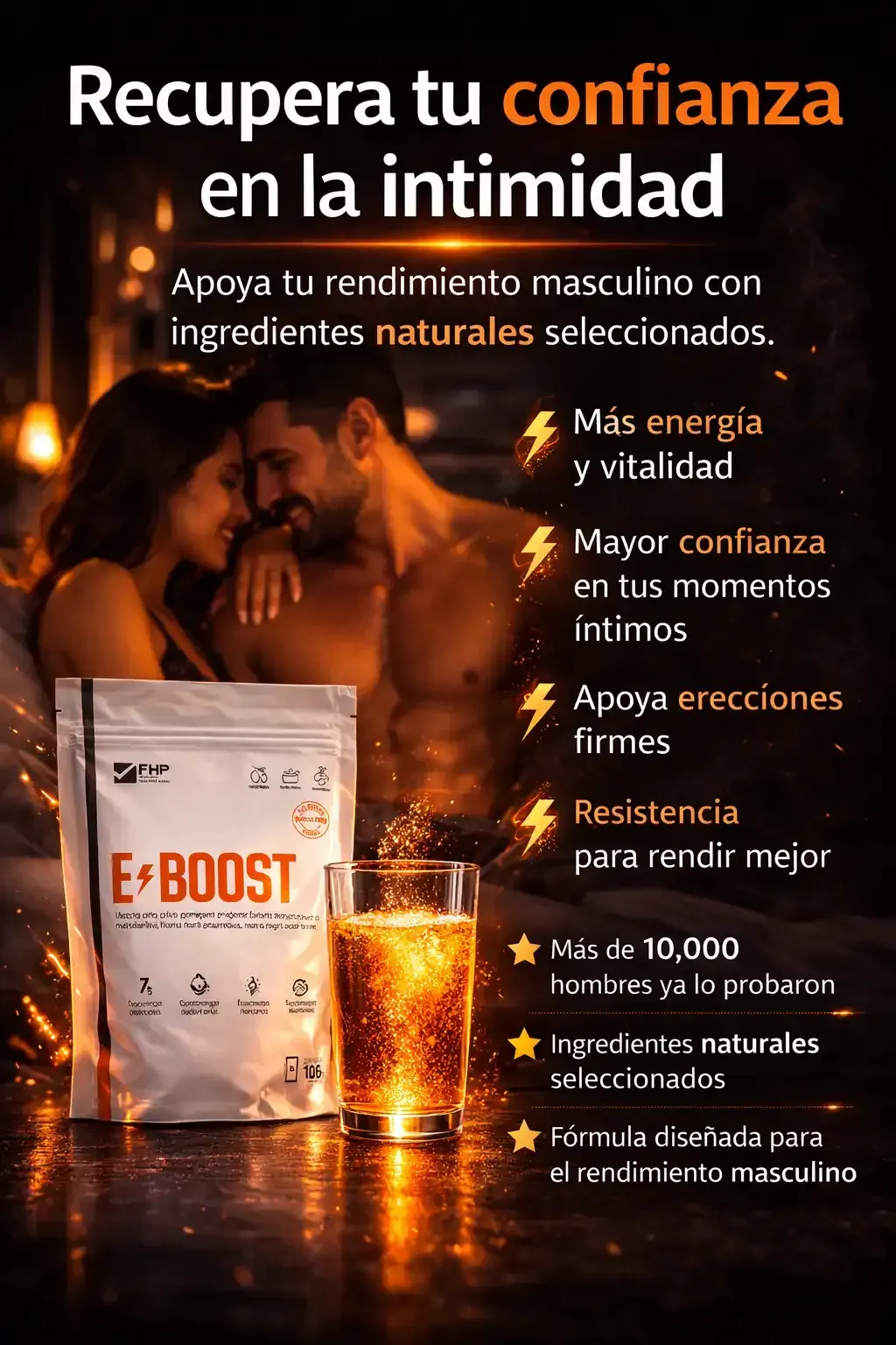 Muchos hombres sienten más energía, firmeza y deseo desde el primer día, y notan resultados consistentes entre los 5 y 10 días de uso continuo. E-BOOST trabaja de forma progresiva, activando tu energía natural y devolviéndote la potencia y seguridad que habías perdido.